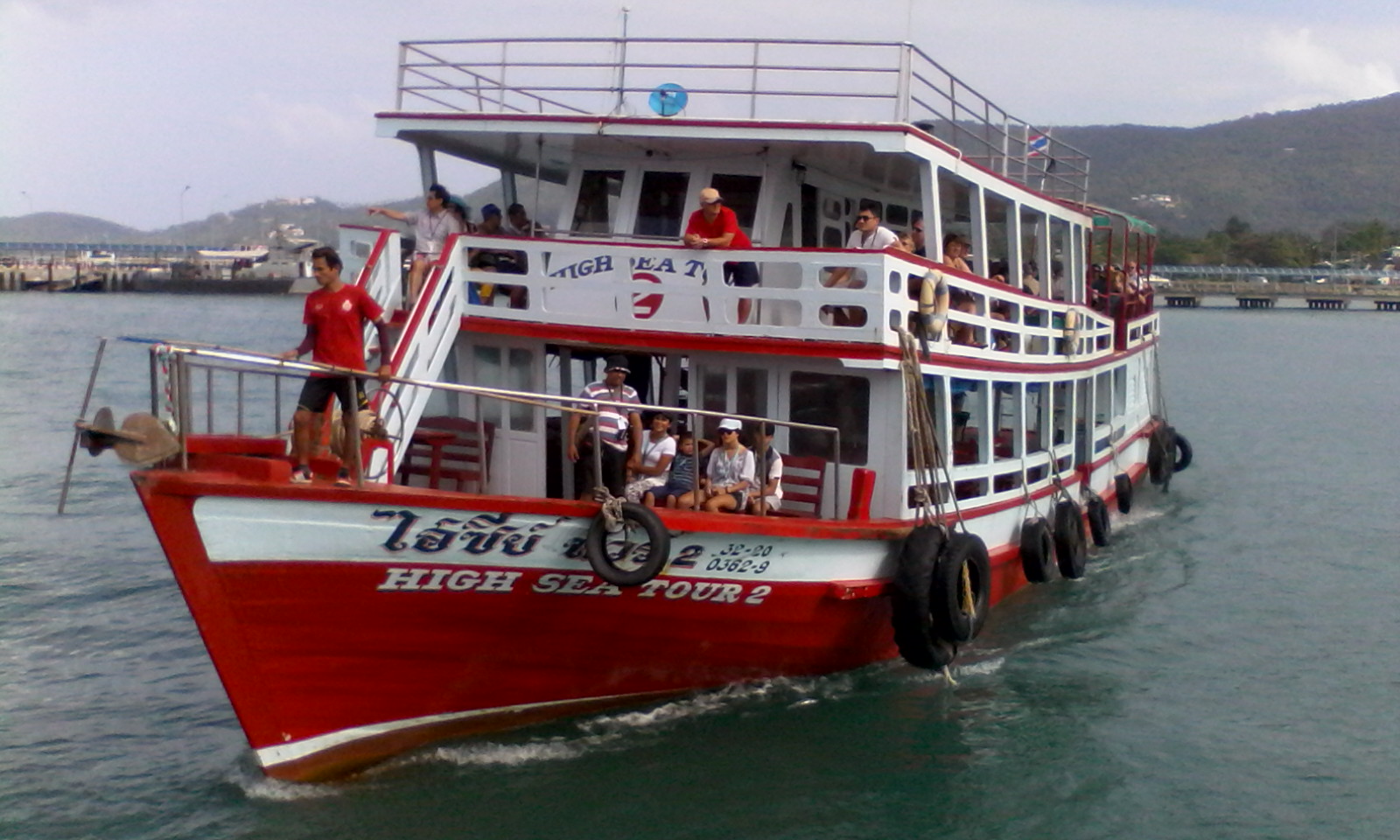Highsea 2 : Name of Vessel Highsea 2 License No. 3220-03629 Hull material Wooden L.O.A. 21.20 Meters Breadth 5.50 Meters Depth 2.20 Meters Gross Tonnage 53.87 Net Tonnage 36.63 Type of engine Diesel Engine Manufacturer Nissan Engine Serial No. RD 10-013271 Number of Engine 1 Number of Cylinders 10 B.H.P. 261.0 KWs Number of passengers 100 The height of shore tender from embarkation gate to waterline 3.20 Meters